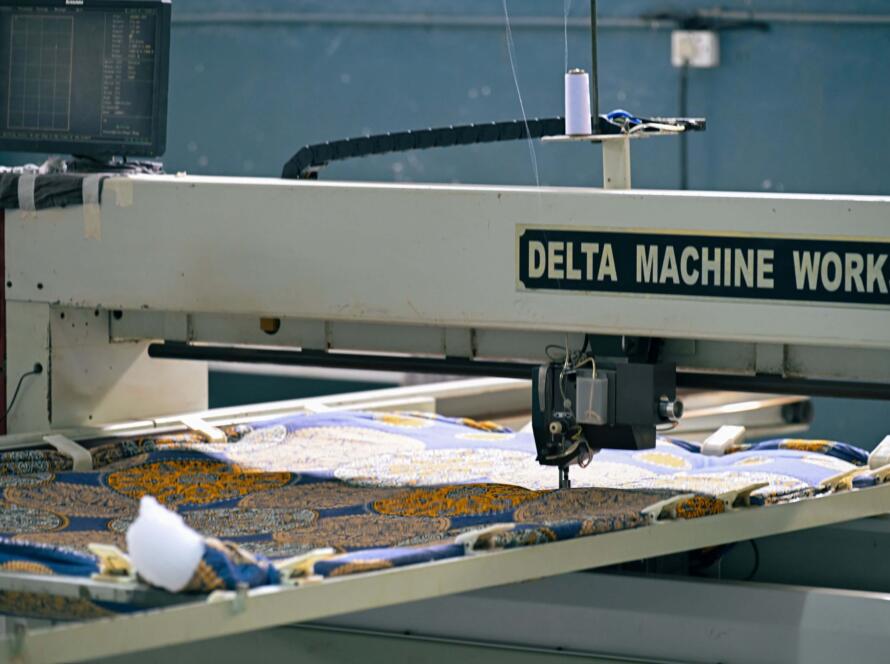 Digitally programmed embroidery heads add artistic motifs and textures to quilted fabrics ideal for premium bedding and hotel collections. Capacity: 400,000 kgs