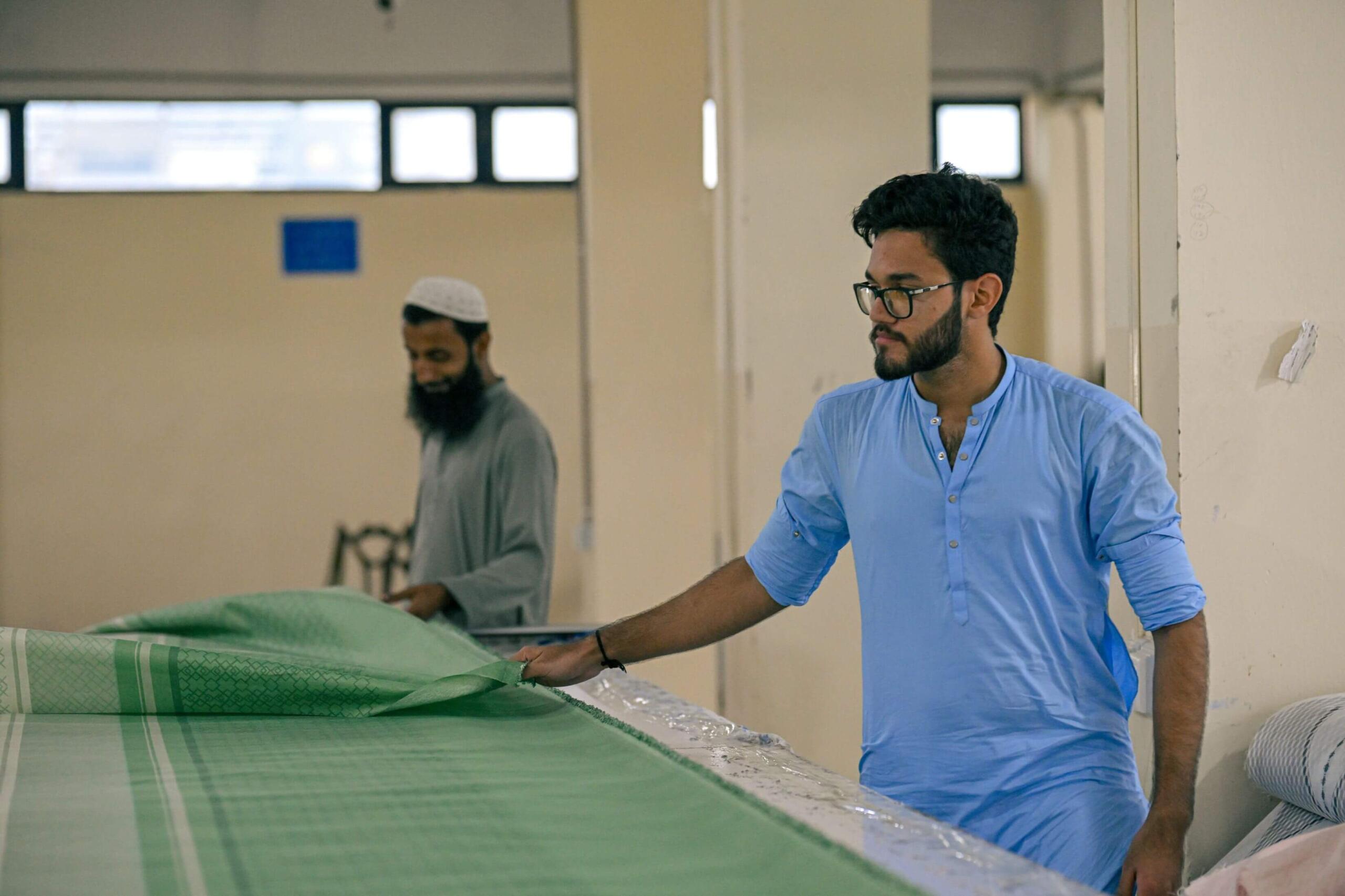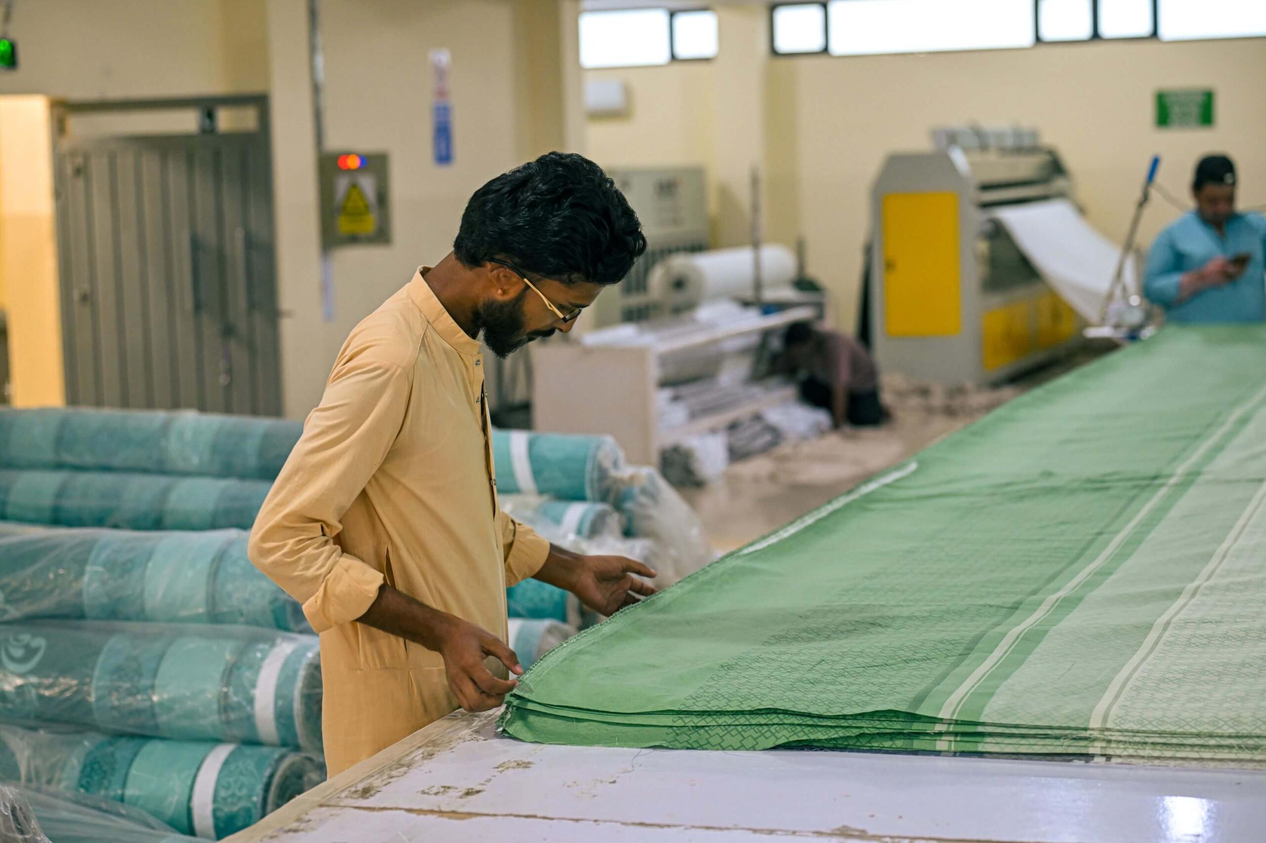 Imported fabrics are spread across large precision tables where automated and manual systems cut each layer to perfect dimensions.
