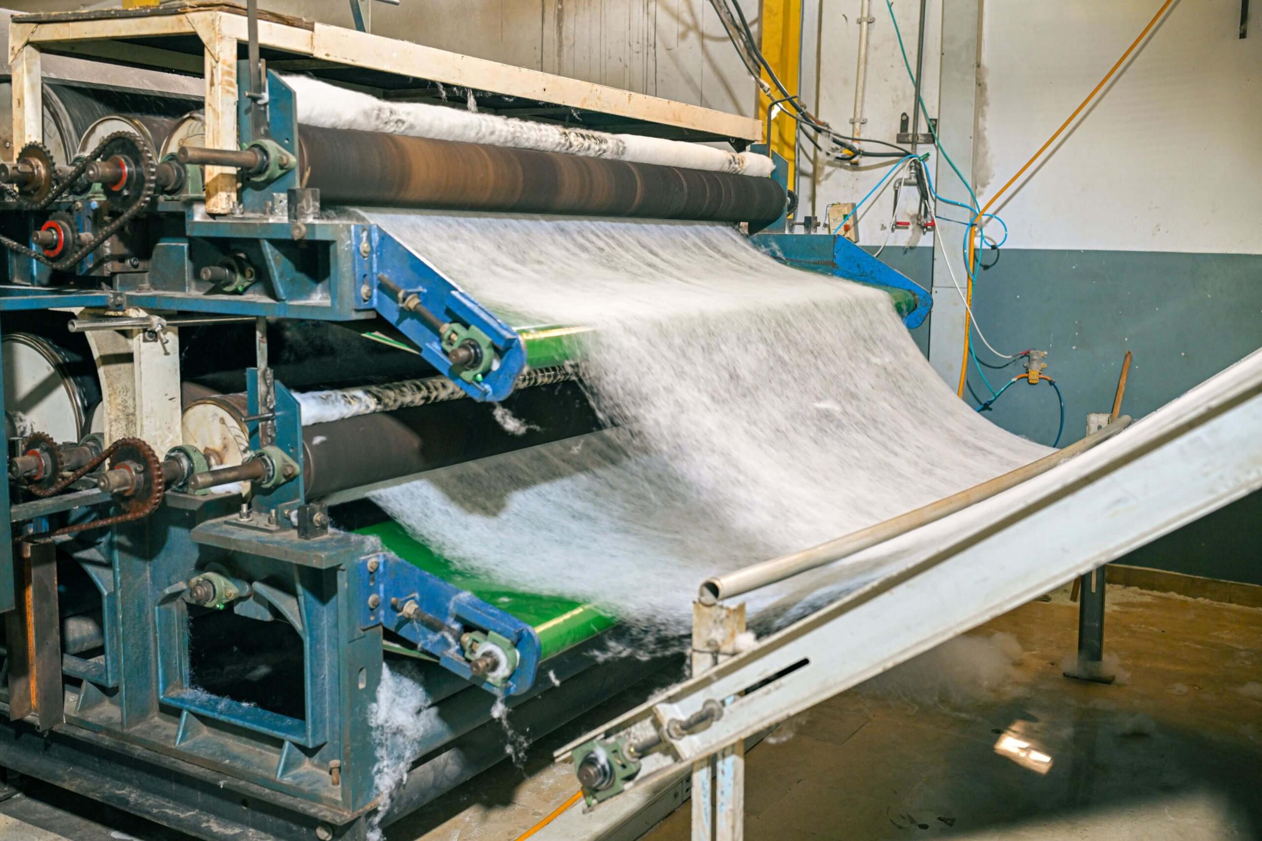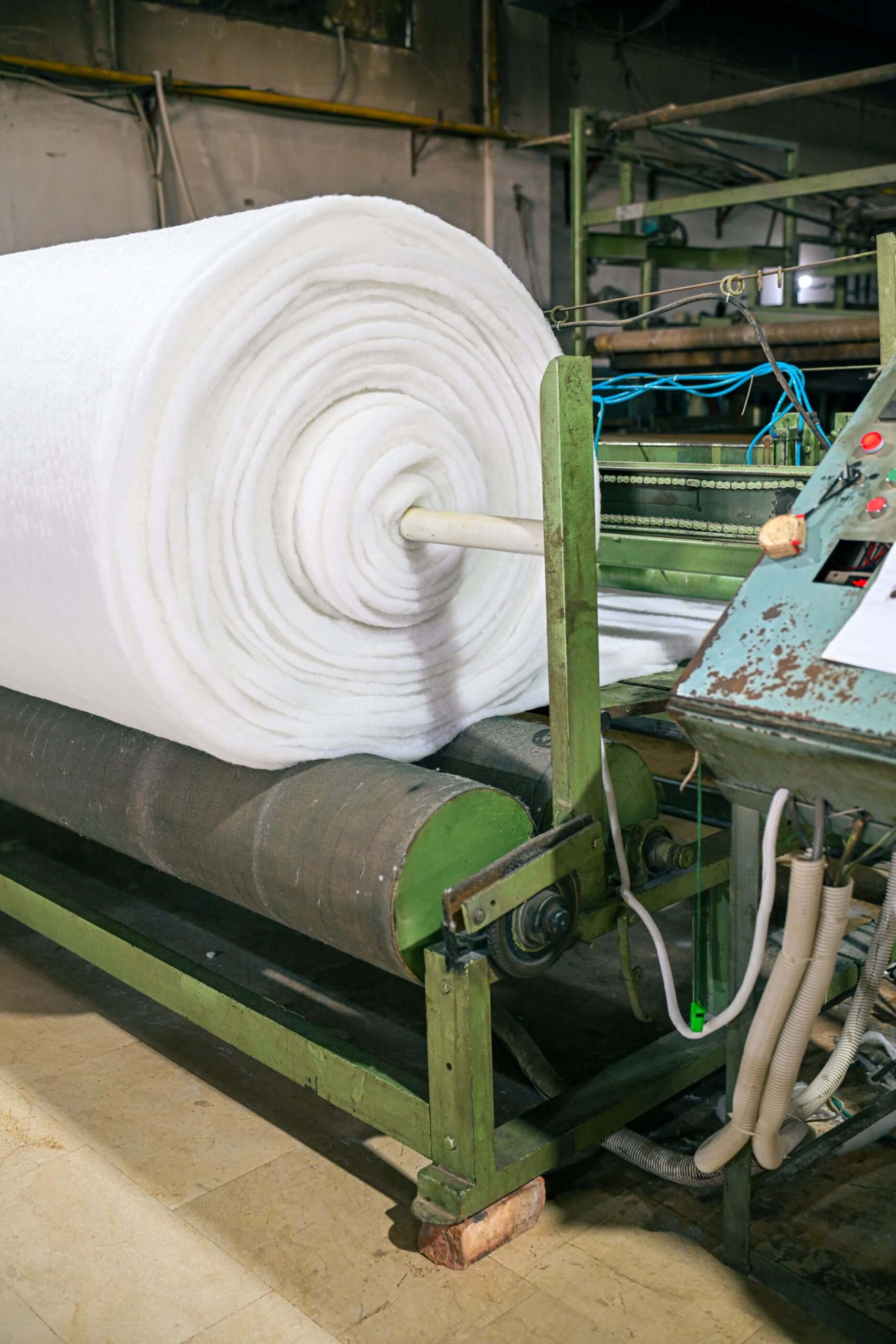 Imported polyester fibers are opened, blended, and layered into soft, even sheets using automated web-forming systems. Thermal bonding produces resilient wadding used in quilts, pillows, and comforters tested for uniform density and durability.
